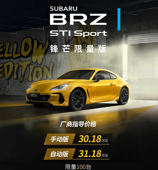日前,新款SUBARU BRZ STI Sport锋芒限量版上市,共推出2款配置,指导价区间为30.18万和31.18万元。作为限量版车型,新车配备带有黄色缝线的制动手柄、座椅、方向盘、车门饰板、100台限量铭牌及黑色BRZ车型徽章等专属配置。